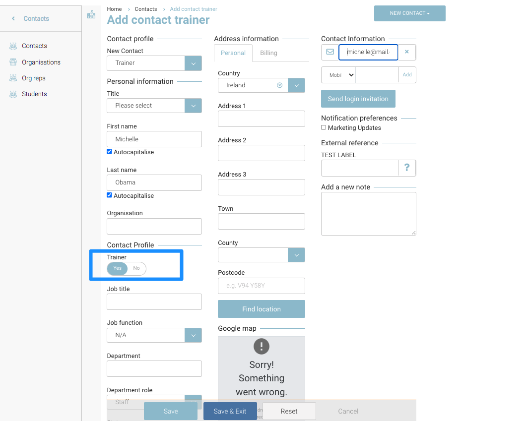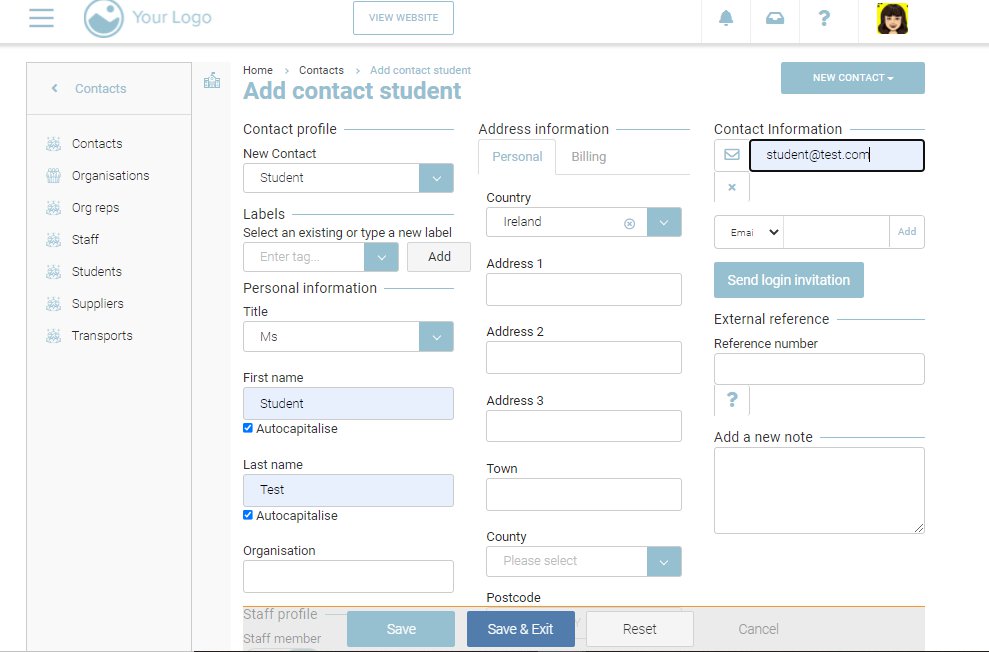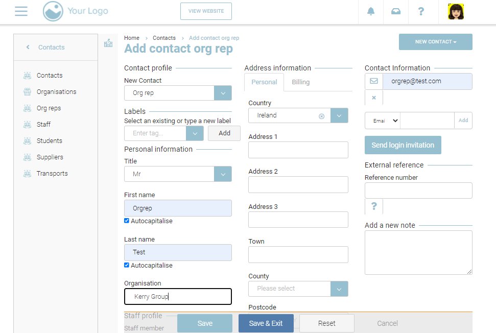 An Organisation contact is created to link an Org rep or a student with the organisation. You cannot invite an organisation contact to Sign up and Log in.