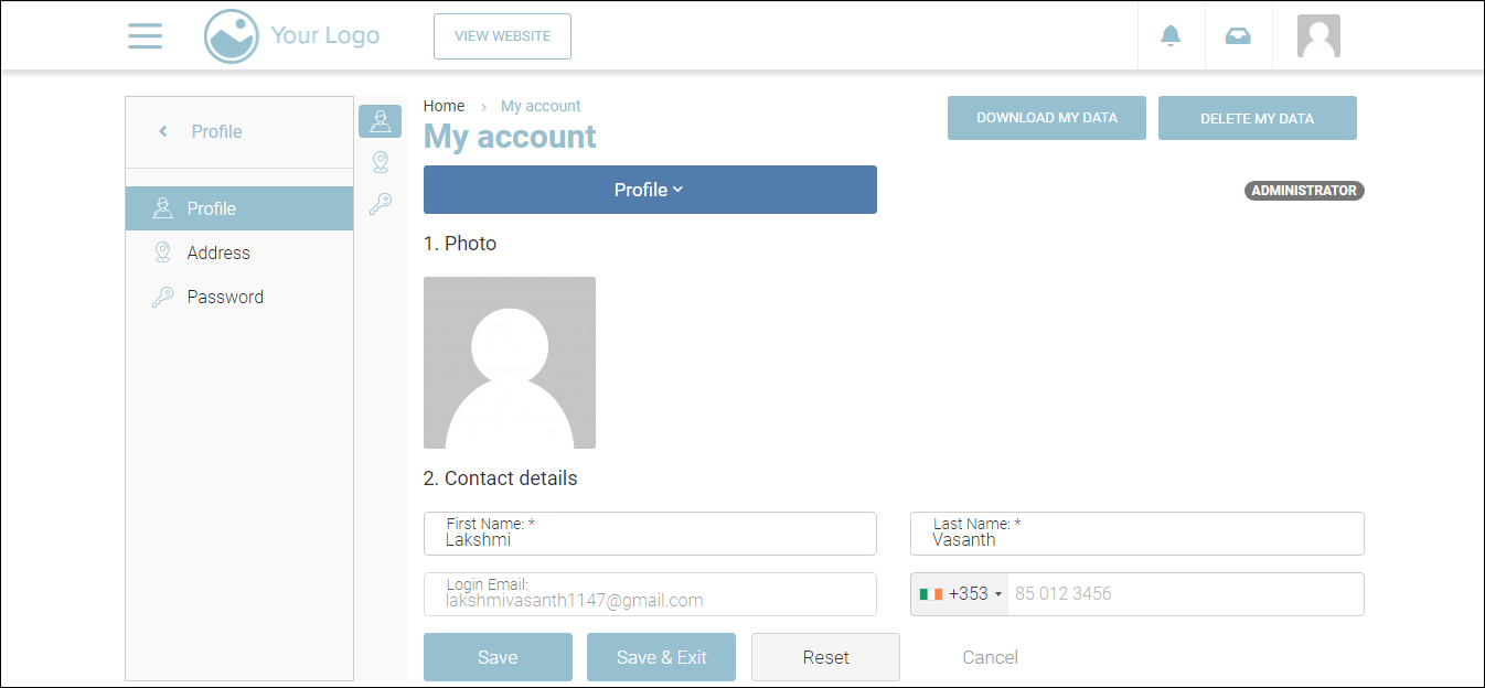 On the Profile page, you can update your profile details including your profile picture and contact details. You can also download your profile data and delete your data.